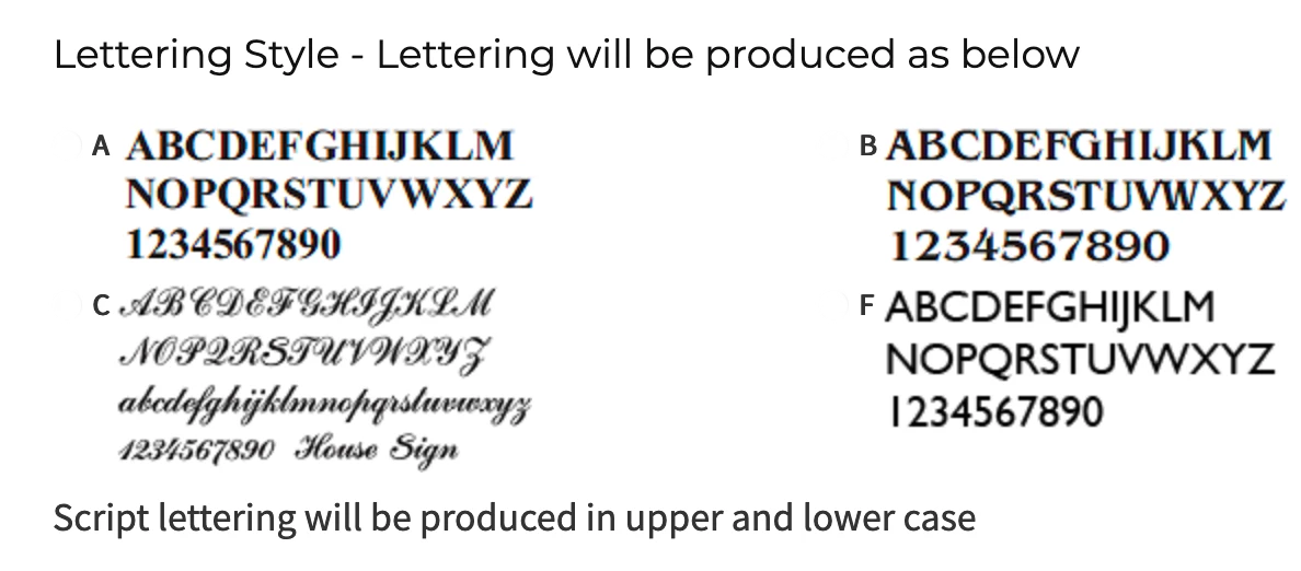More lettering can fit into your sign when using Script (Lettering Style C).Script (Lettering Style C) will be produced in upper & lower case.