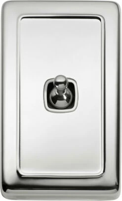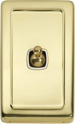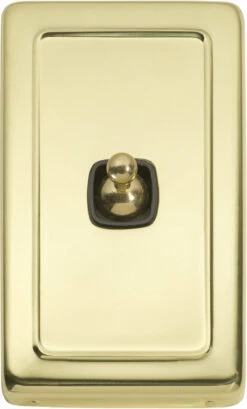 Flat plate 1Â gang toggle switches with brass covers and HPM mechanisms. Matching sockets and compatible accessories also available.