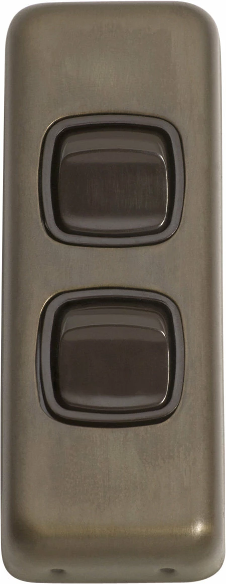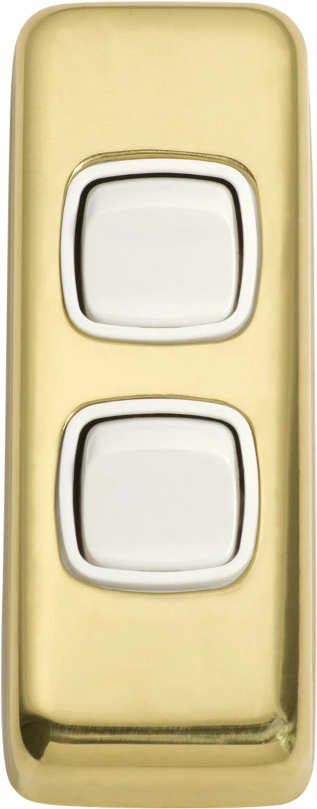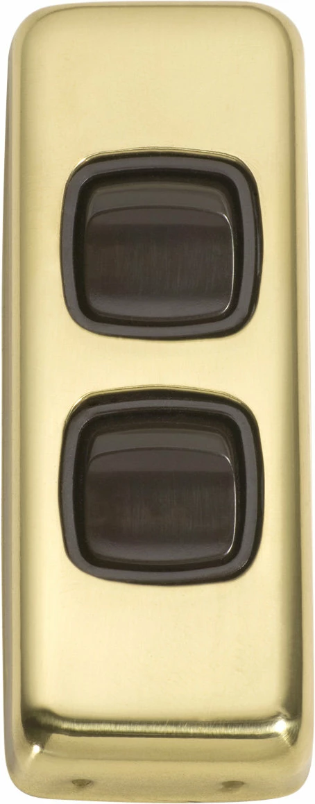 Flat plate 2Â gang rocker switches with brass covers and HPM mechanisms. Matching sockets and compatible accessories also available.