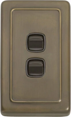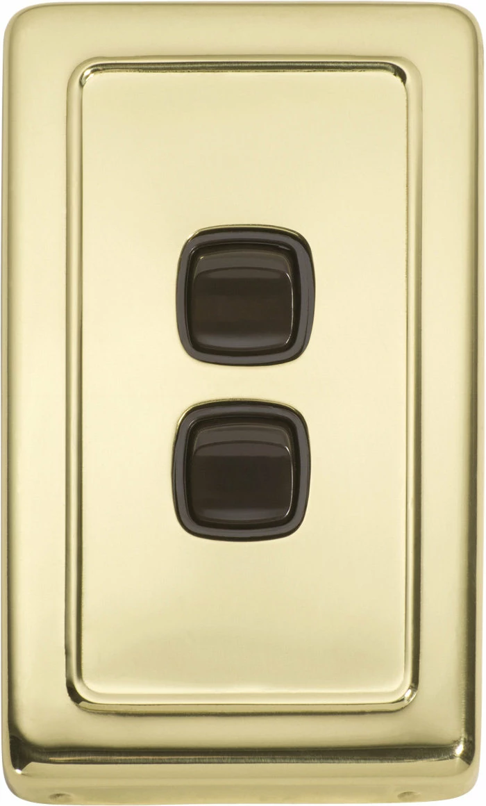 Flat plate 2 gang rocker switches with brass covers and HPM mechanisms. Matching sockets and compatible accessories also available.