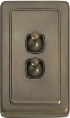 Flat plate 2Â gang toggle switches with brass covers and HPM mechanisms. Matching sockets and compatible accessories also available.