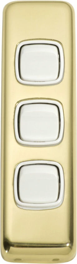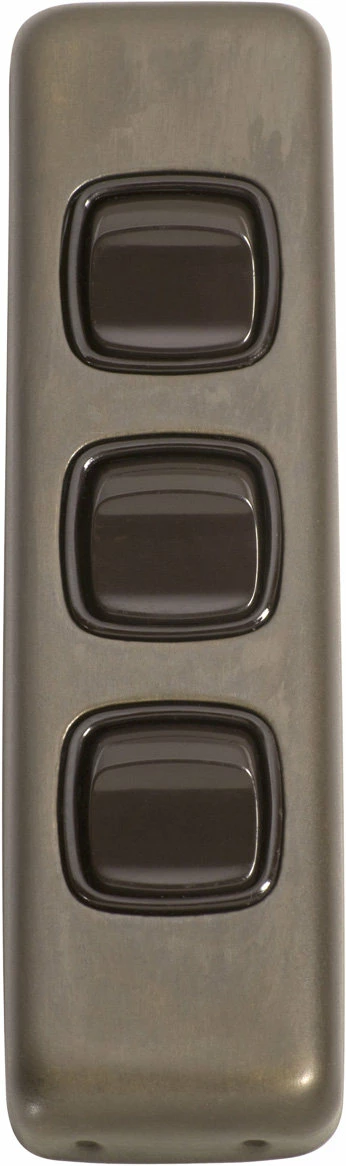 Flat plate 3 gang rocker switches with brass covers and HPM mechanisms. Matching sockets and compatible accessories also available.