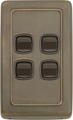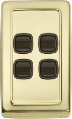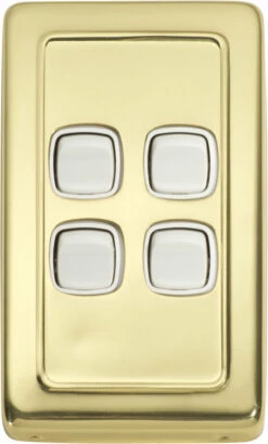 Flat plate 4Â gang rocker switches with brass covers and HPM mechanisms. Matching sockets and compatible accessories also available.