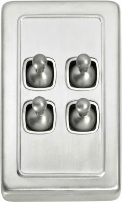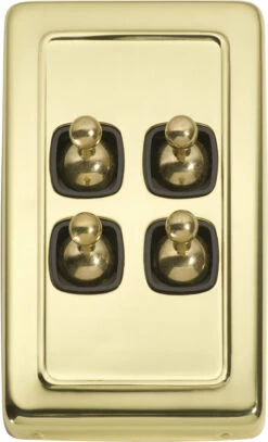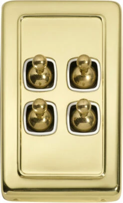 Flat plate 4 gang toggle switches with brass covers and HPM mechanisms. Matching sockets and compatible accessories also available.