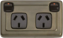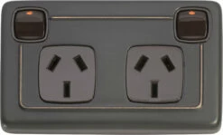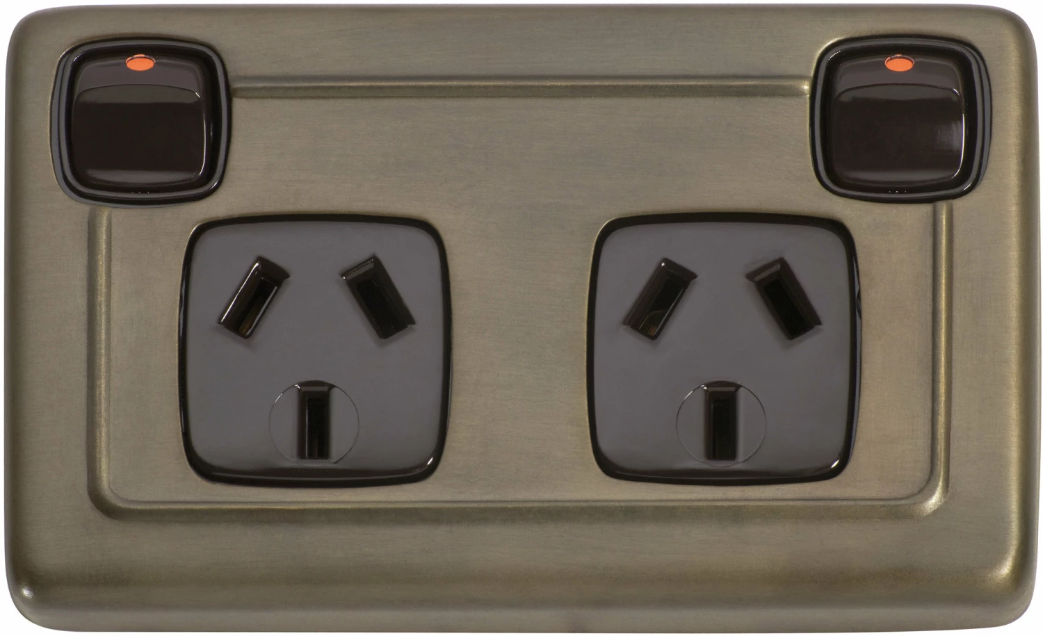 Flat plate sockets with rocker switches and brass covers. Available in single or double socket with 1, 2 or 3 switches with white, brown or black HPM mechanisms.