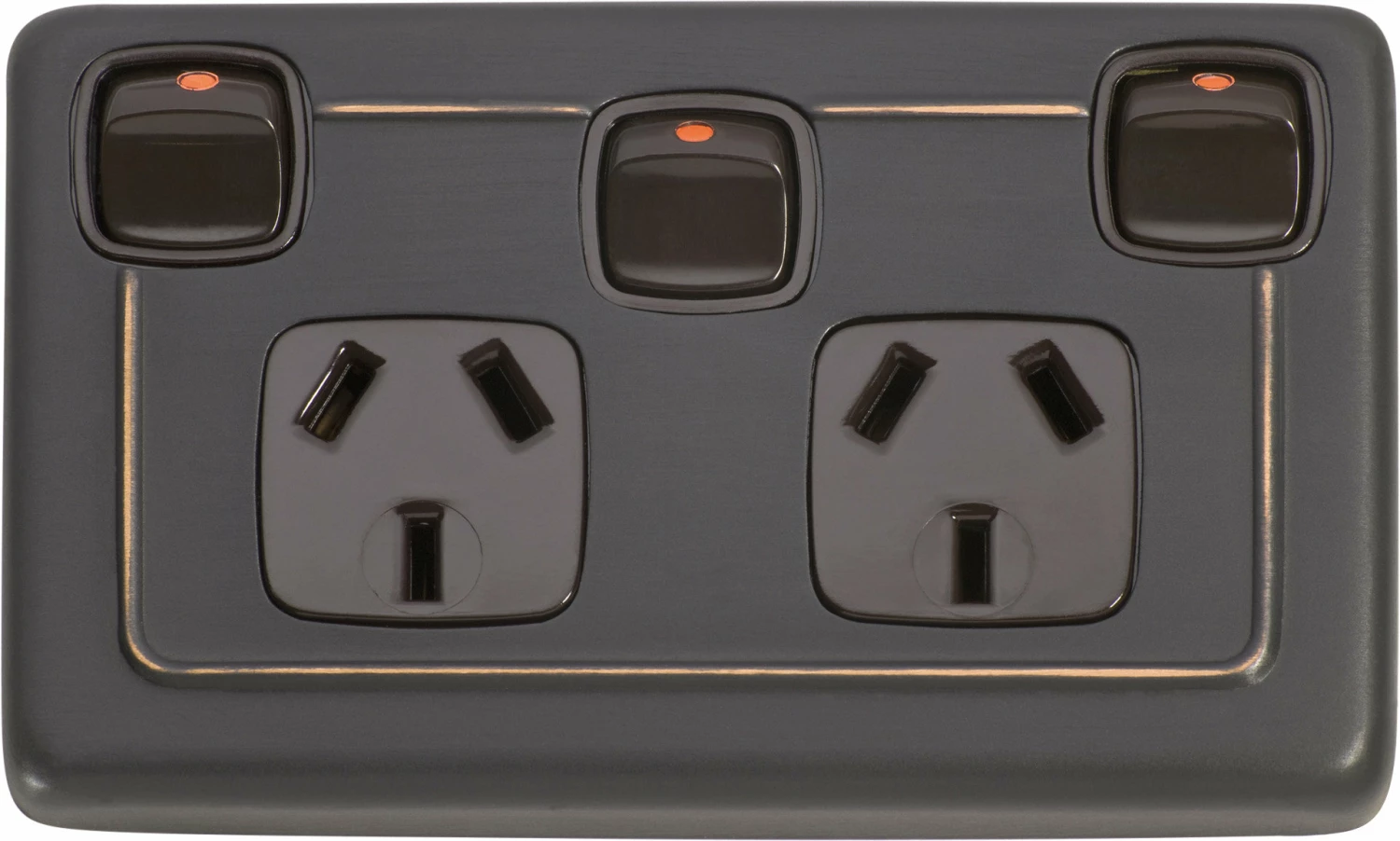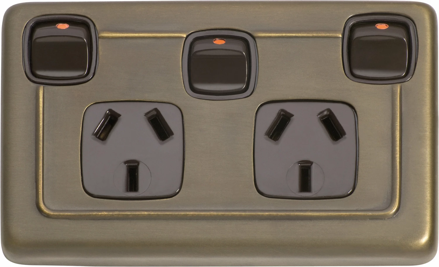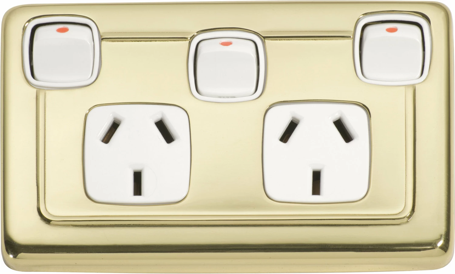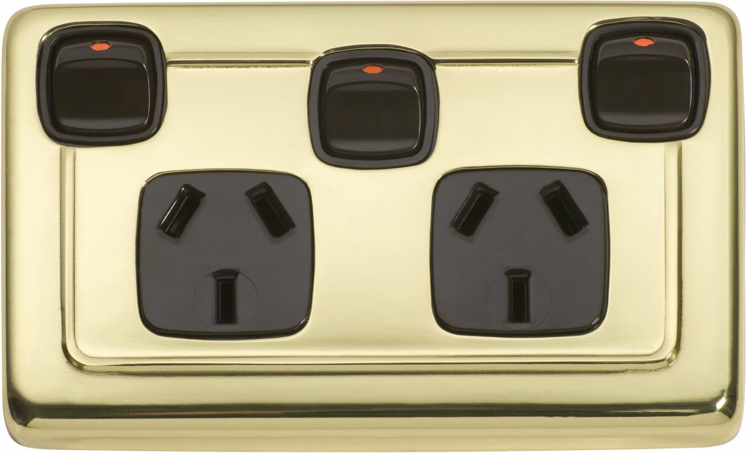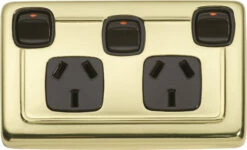 Flat plate sockets with rocker switches and brass covers. Available in single or double socket with 1, 2 or 3 switches with white, brown or black HPM mechanisms.
