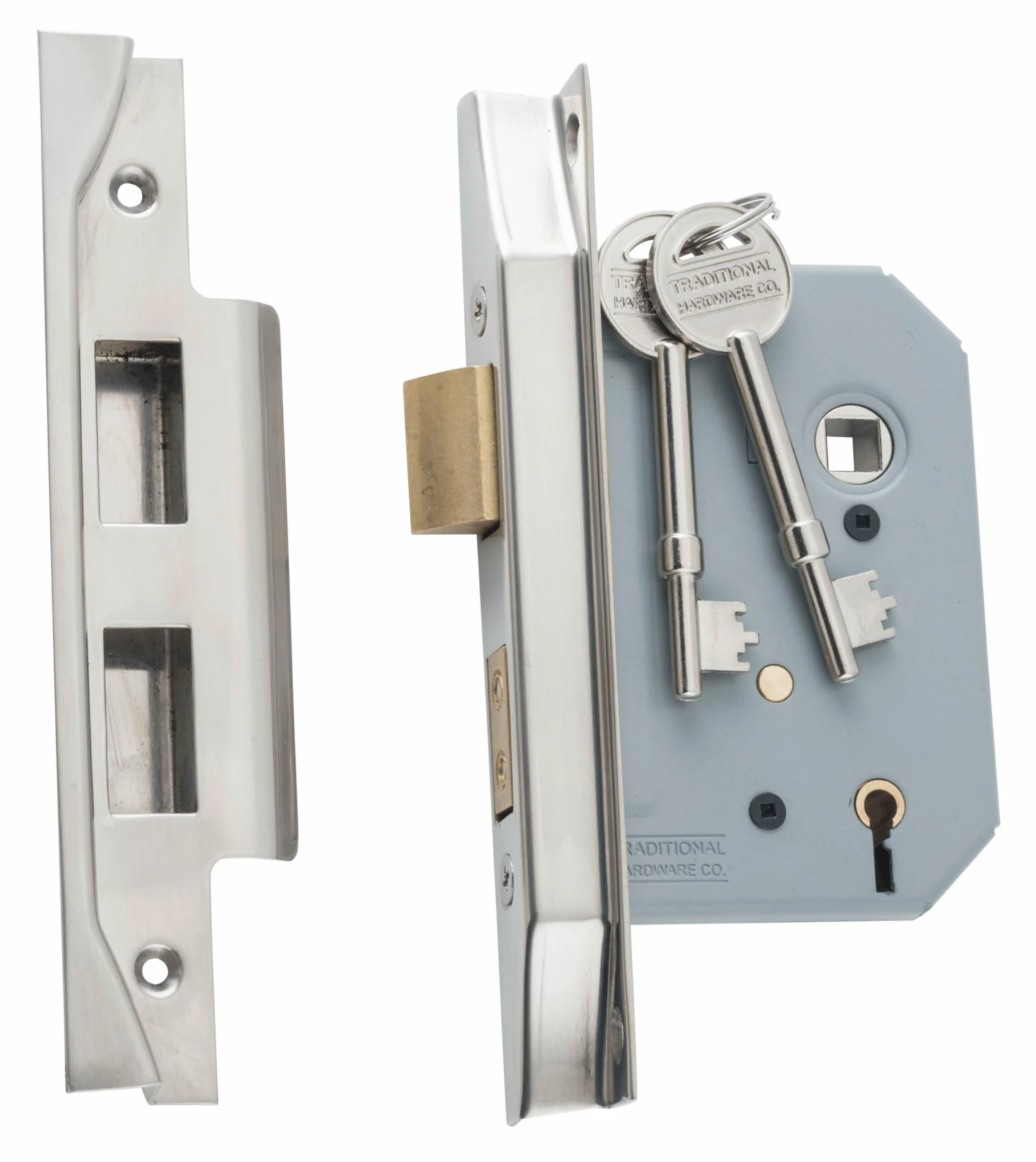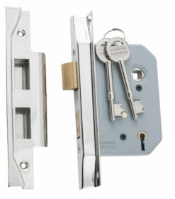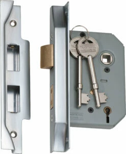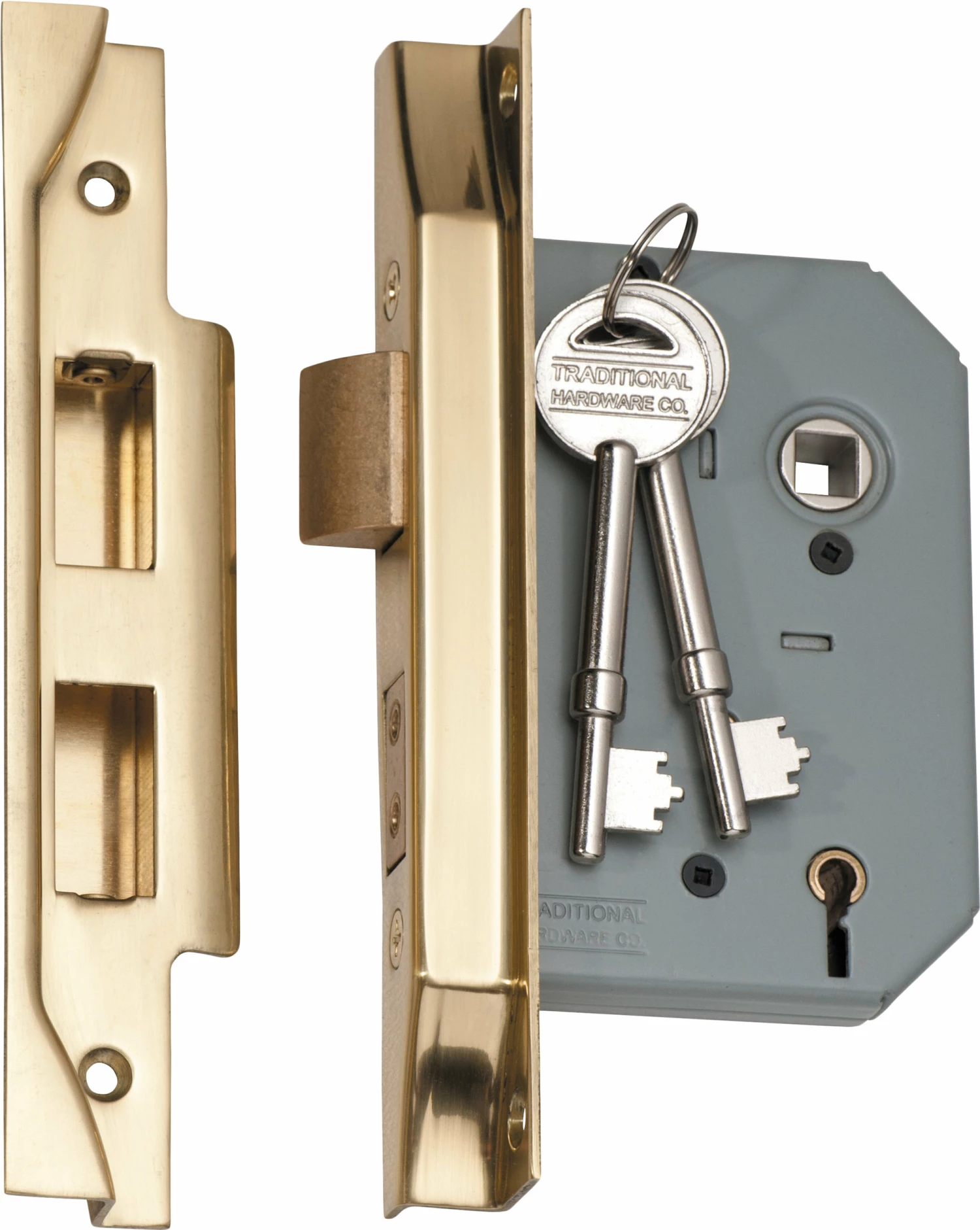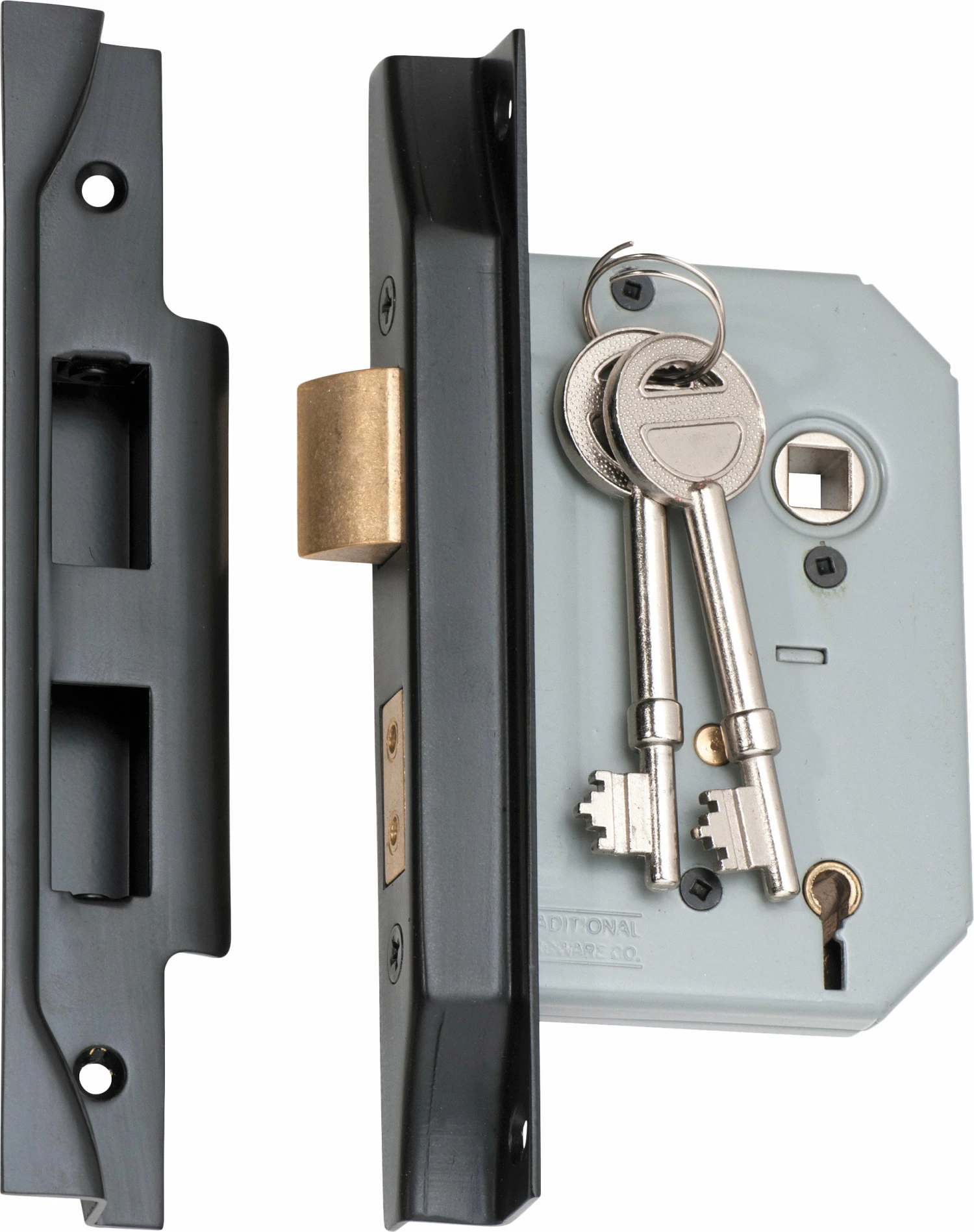 Rebated 5 lever high security mortice lock for external applications. Solid brass face and striker plates. Reinforced steel pins. Anti pick curtain. Reversible tongues. Keyed alike or random keyed. Tested over 130,000 cycles. Fitting instructions supplied.