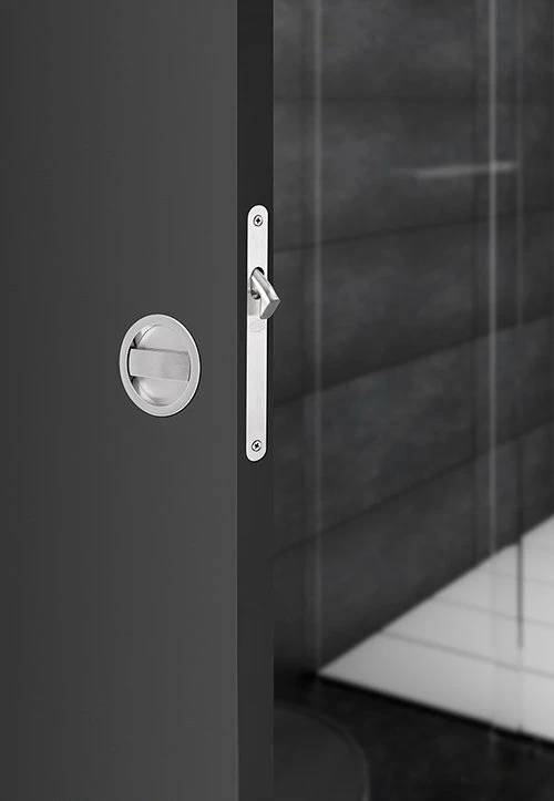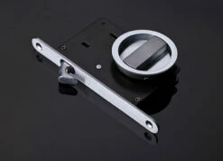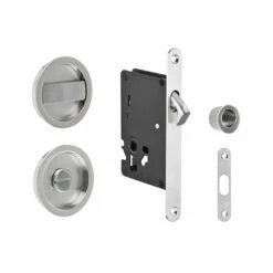 The 8106 privacy kit includes 2x 55mm diameter flush pulls, a mortice lock and complimentary edge pull. The edge pull allows you to pull the door out of the cavity when it is fully recessed in.